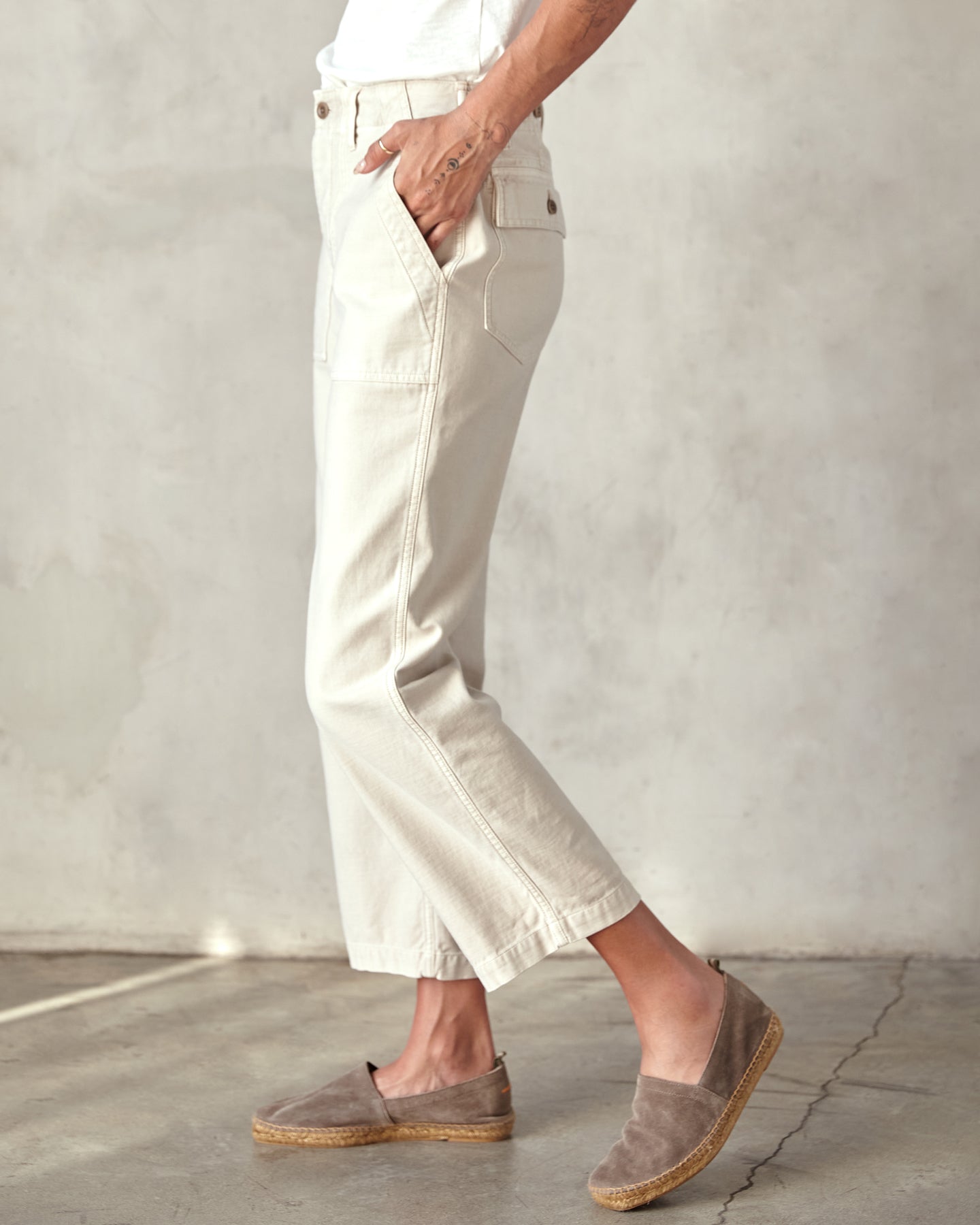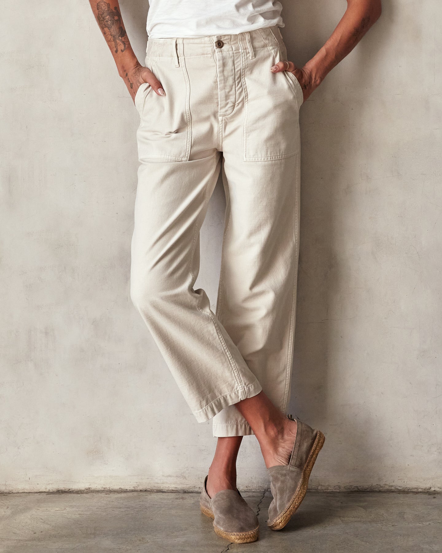 Vintage military pants reimagined for the perfect blend of utility and style. Equipped with lots of pockets for endless versatility and an incredible garment wash for a lived-in feel that only gets better with wear. High-rise and fitted at the hips with a straight leg opening of 17". Designed with adjustable tabs on back to cinch high at the waist or sit naturally on your body. Oversized patch pockets. Corozo nut button fly.